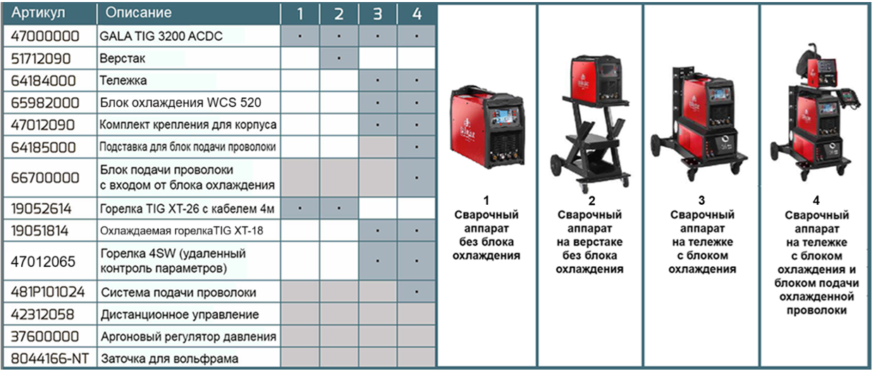 Аппарат Gala AC/DC 3200 позволяет использовать как неохлаждаемые, так и охлаждаемые горелки. Рекомендуемые горелки: